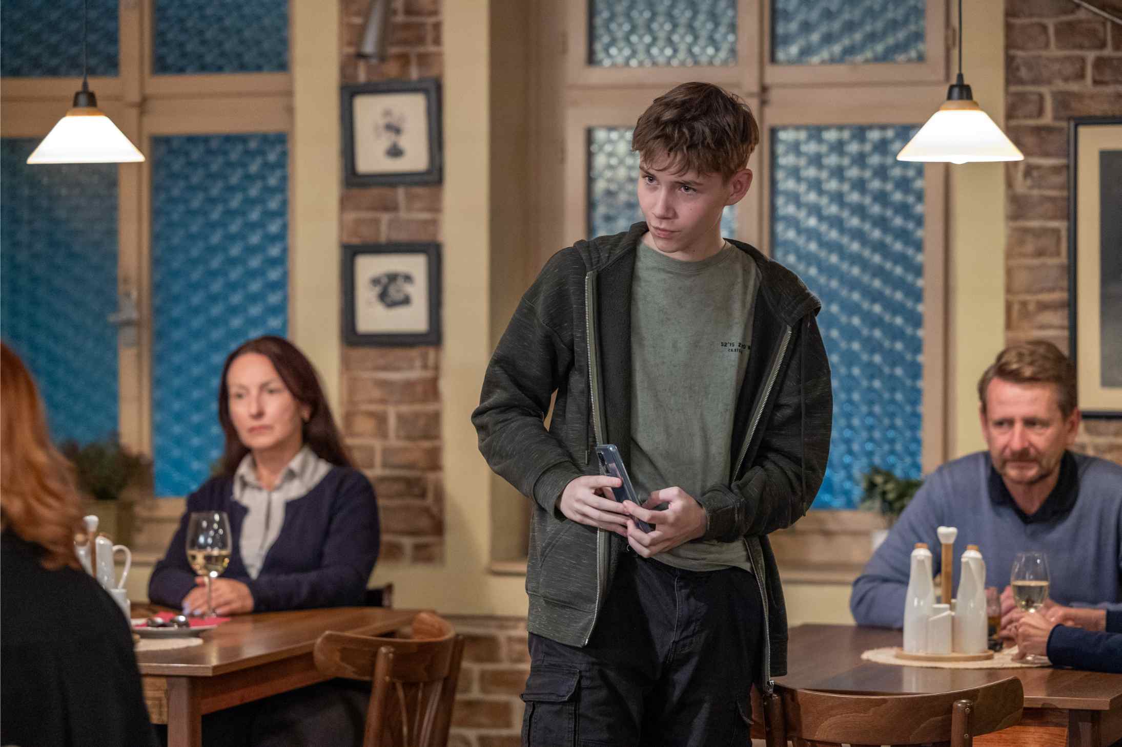 Egon se pokouší urovnat vztahy s Erikem. Prosí ho o schůzku, ale ještě předtím se v hospodě omlouvá Mileně. Předává jí finanční obnos jako kompenzaci za scény, které v podniku předvedl předchozího dne. Tvrdí, že chce mít alespoň částečně čisté svědomí.