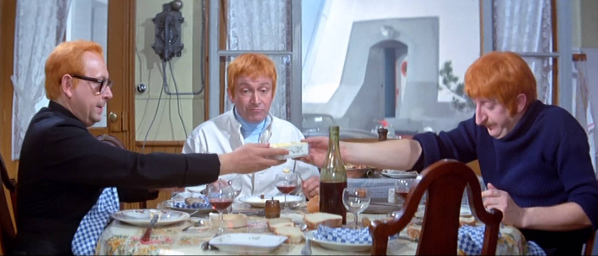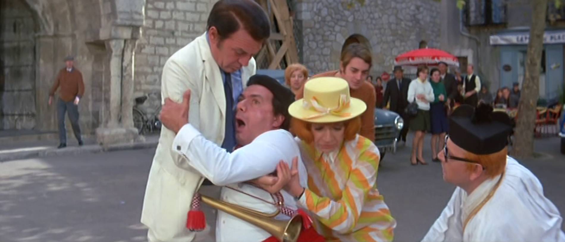 Při jedné ze scén Dhéry napodobil pláč Stana Laurela s takovou přesností a komickou naléhavostí, že to odbouralo i samotného Funèse. Ten se údajně začal smát tak nezřízeně, že musel natáčení přerušit a svůj záchvat smíchu skrývat pod dekou, aby se mohl uklidnit a pokračovat v práci. Byl to jeden z mála okamžiků, kdy šla ega stranou a zůstala jen čistá radost z řemesla. Po skončení natáčení se vztahy mezi oběma muži urovnaly a jejich přátelství se vrátilo do starých kolejí.