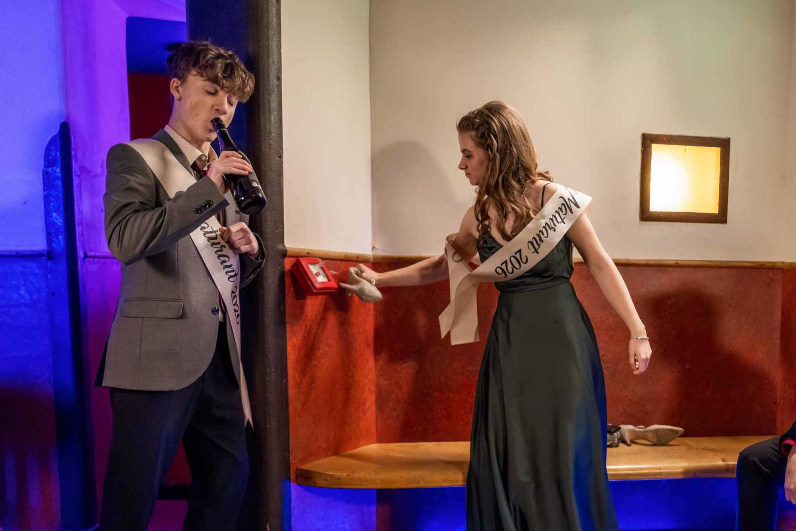 Kritický zlom nastal s blížící se půlnocí. Naplánované překvapení večera zcela zhatil ostrý zvuk požárního alarmu. Všichni přítomní museli okamžitě opustit budovu a vyjít na ulici. Organizovaná zábava se bleskově proměnila v neřízený zmatek a obrovskou nervozitu na chodnících před školou.