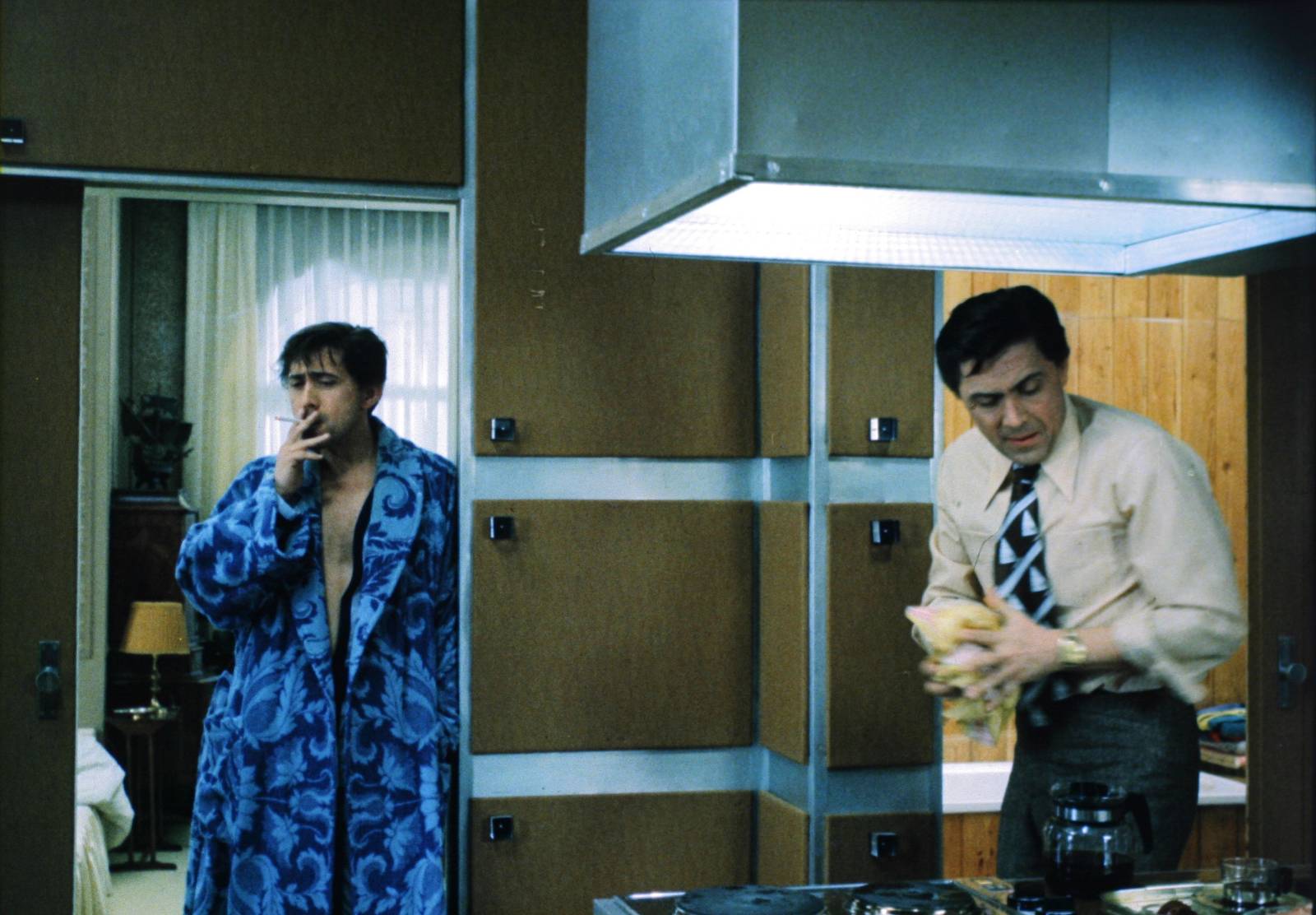 Filmaři používali metodu vertikálního dělení obrazu. Polovina objektivu se zakryla, natočila se jedna postava, film se přetočil zpět a doexponovala se druhá polovina. Pro Kostku to znamenalo obrovský psychický tlak. Musel hrát s vědomím, že jakákoliv chyba v druhé části záběru zničí i tu první, již natočenou. Herec později přiznal, že to pro něj bylo nervy drásající. Musel vést dialog sám se sebou, hlídat si oční kontakt do prázdna a reagovat na repliky, které v tu chvíli nikdo neříkal.